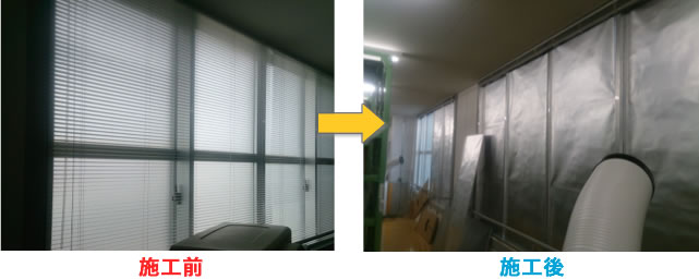 【施工前】 シャッター付近が暑過ぎる。 【施工後】 スポットクーラーが不要になった (マジックテープ使用で取外しも可能)。